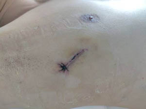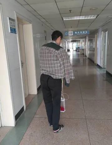患者术后第1天,胸腔引流瓶淡红色引流液约50ml,输液结束拔除导尿管,自行下床活动。