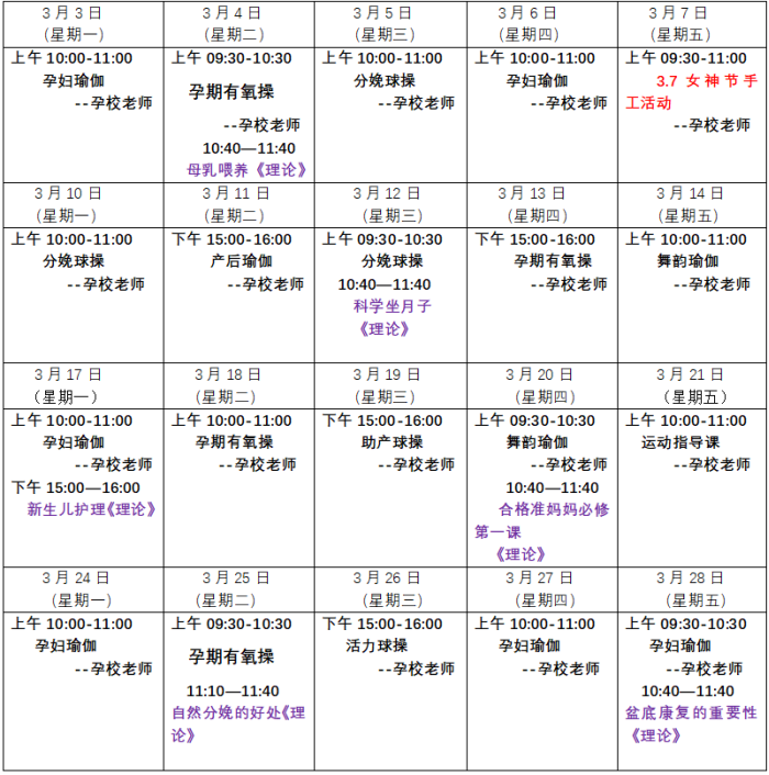 孕妇学校3月份课程表