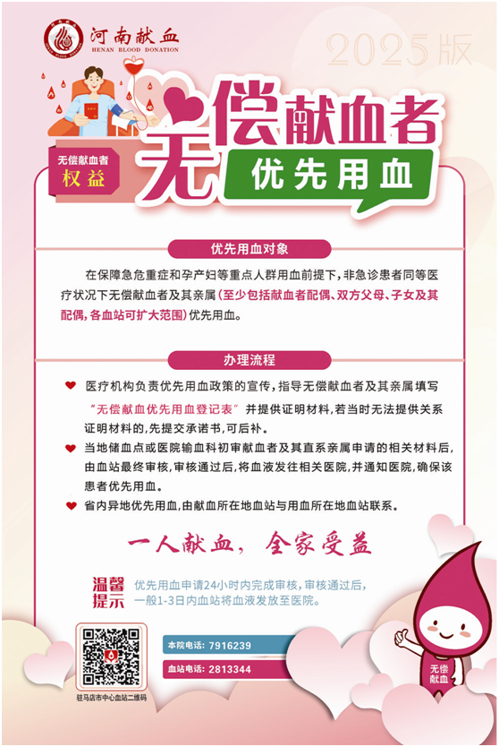 为深入贯彻落实《中华人民共和国献血法》、河南省实施《中华人民共和国献血法》办法,进一步广泛宣传无偿献血的意义,优化无偿献血者及其亲属用血费用减免服务,提升无偿献血者获得感,按照国家卫生健康委办公厅《关于进一步落实血费减免一次都不跑工作的通知》要求,我院积极响应并快速实施了无偿献血者的权益保障。
