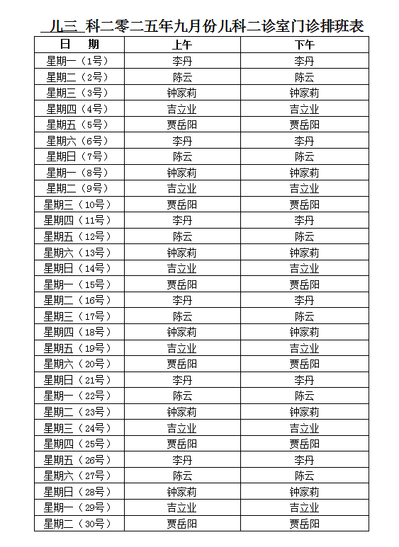 儿三科9月值班