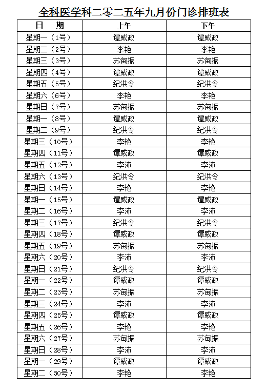 全科医学科9月排班