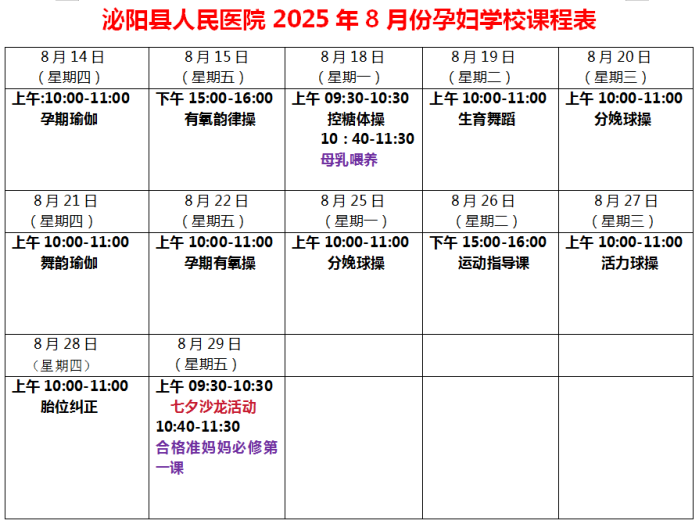 3.请各位孕妈妈合理安排时间,尽量不要迟到哦!孕妈妈们不要看错时间,课表如有改变会及时通知大家