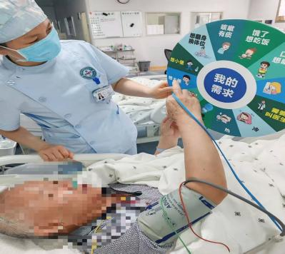 神经重症护理团队针对语言交流障碍的患者,精心制作了图文并茂的小转盘,转盘内容涵盖了最常见、最重要的需求(如:疼痛、有痰、喝水、翻身、便盆、冷/热、呼叫家人等),患者可以通过手指指出或简单的点头眨眼来传达他们的生理和心理需求。护理人员通过细致入微的观察和及时响应,确保每一位患者都能得到精准、贴心的关怀,真正实现了以人为本的护理理念。
