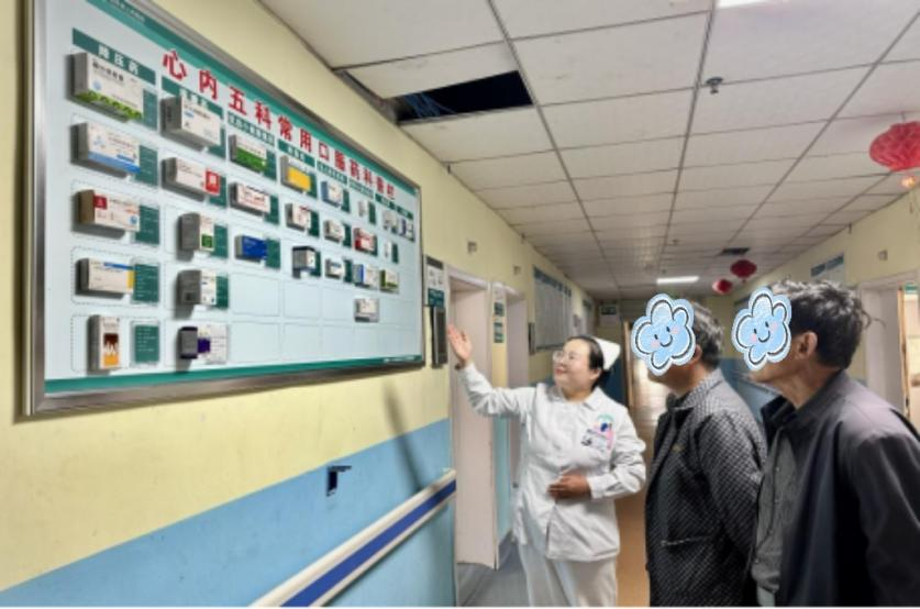 针对老年慢性病患者多、用药复杂易出错等问题,科室以“一科一品”为契机,创建了“科室常用口服药健康科普栏”。科普栏聚焦降压药、抗血小板药等心内科常用药物,采用“实物药盒+说明卡片”的形式,清晰展示药物的作用、用法与注意事项,将专业知识转化为易懂的“用药指南”。既方便患者和家属随时学习,也成为护士健康宣教的实用工具,有效提升了患者用药安全与依从性。