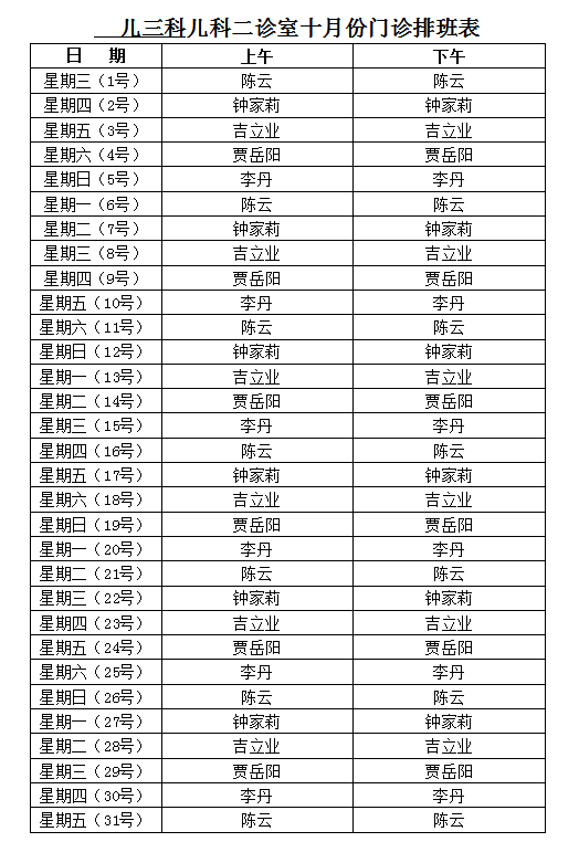 儿三科儿科二诊室十月份门诊排班表