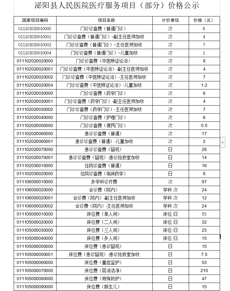 泌阳县人民医院医疗服务项目(部分)价格公示