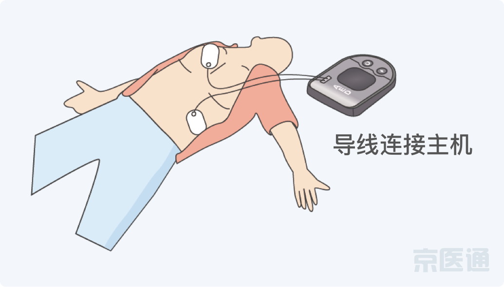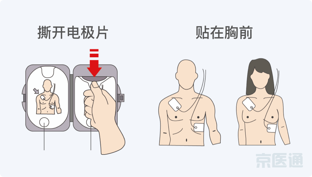 贴:按图示将电极片贴在患者裸露的胸前。