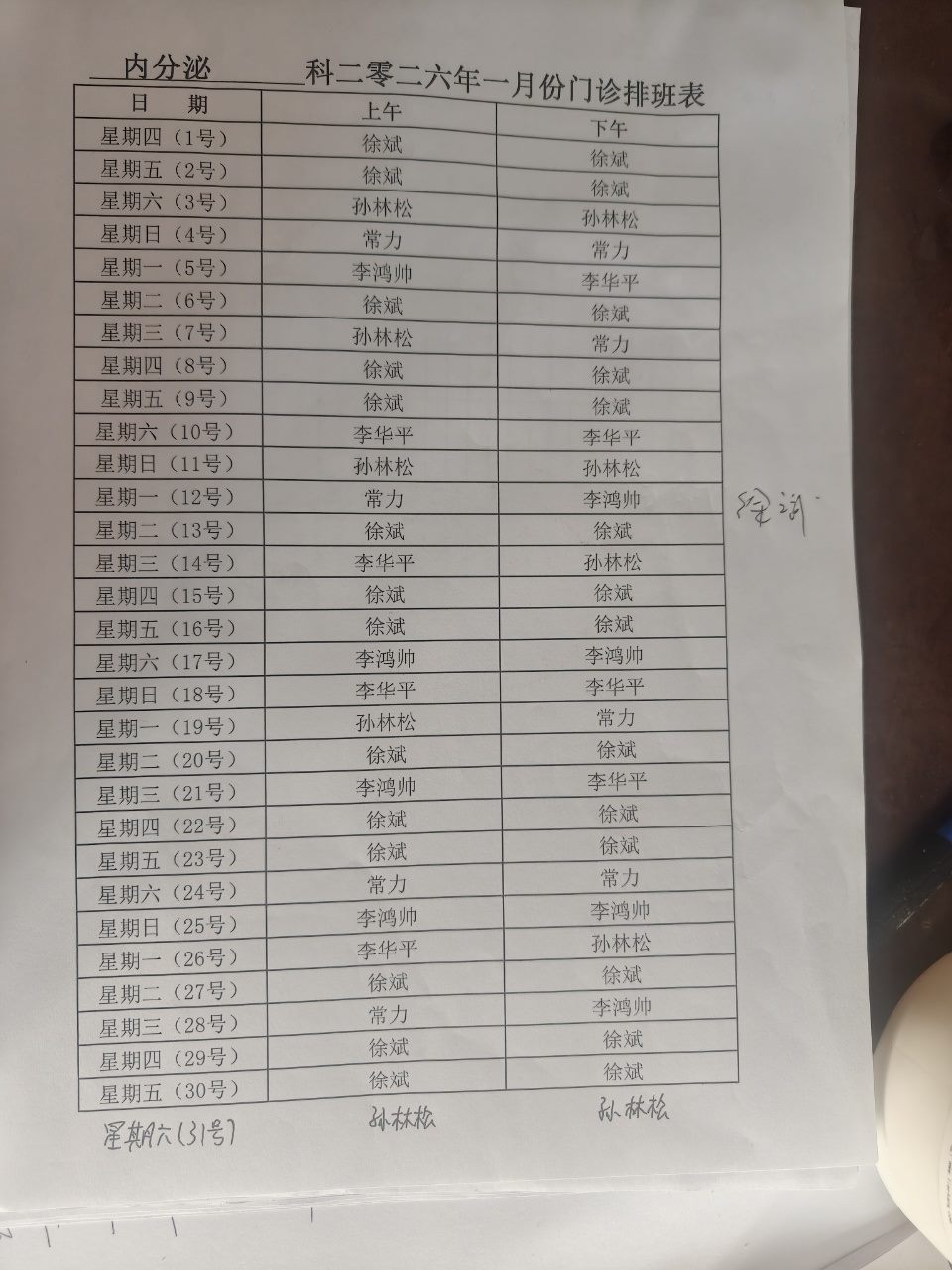 内分泌科2026年1月份门诊排班表