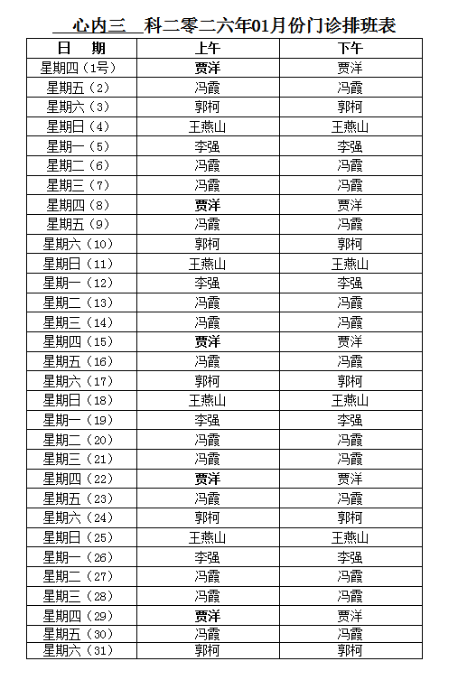 心内三科2026年1月份门诊排班表